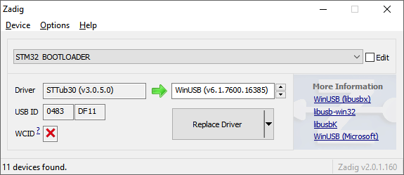 najdeme STM32 BOOTLOADER a volime Replace driver