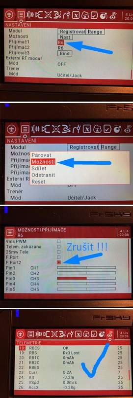 S tou zradou F.Port jsem měl správné tušení. Je třeba v nastavení přijímače (v mém případě obou přijímačů) zrušit zaškrtnutí u volby F.Port2, které se záhadně po flashnutí samo zakliklo. Teď už zase mám svých 30 čidel telemetrie :lol: