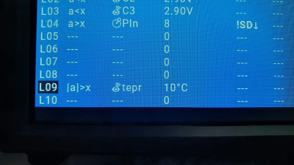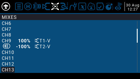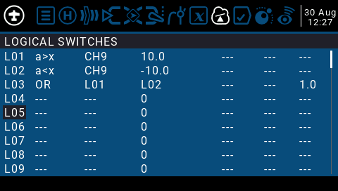 Neskúšal som, ale na rýchlo by to mohlo fungovať. Vytvor si pomocný kanal (CH9). Skrátka jeden vstup (T1) sa sčíta so záporným vstupom (T2) a súčet, výstup kanálu bude viac ako 10 alebo menej ako -10 a zapne sa log. spínač L3. Možno je niekde chybka, ale skús, základ máš.