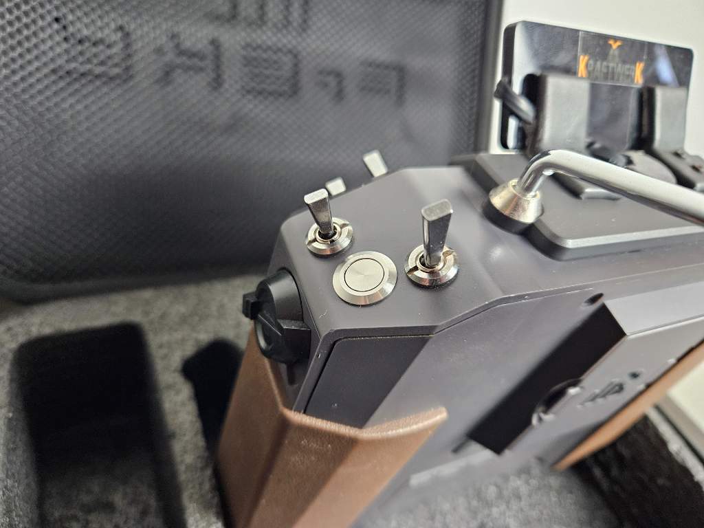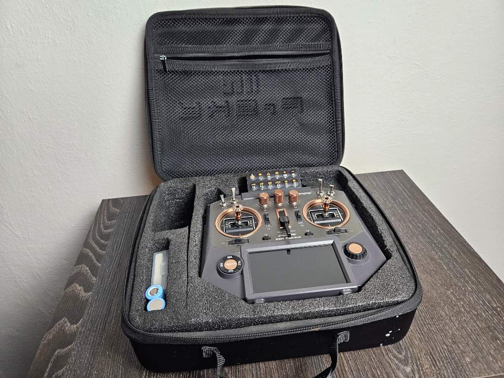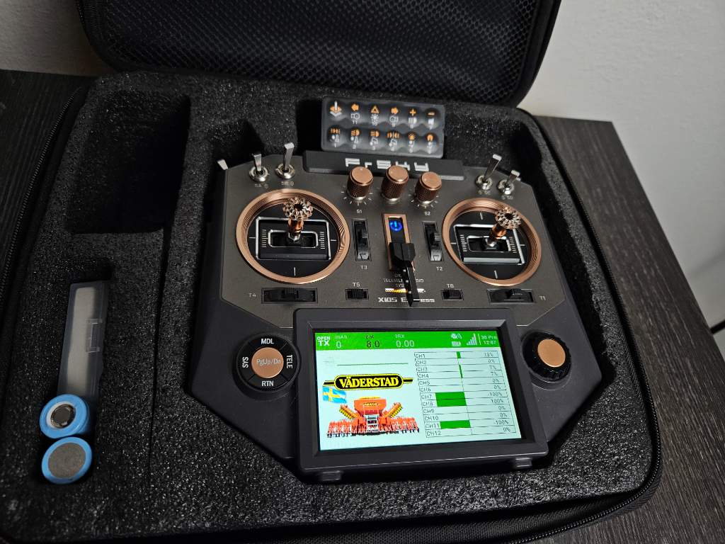 24kanálů, dvě tlačítka navíc, Kraftwerk pad dostavba k ovládání jednotek BEIER, dva páry liion baterií, popruh Frsky, samozřejmě EVA pouzdro (je bohužel potřísněno barvou, nemá na nic vliv), vše aktualizováno.