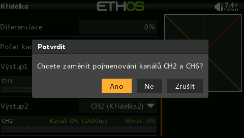 Modely založené průvodcem v Ethosu neumožňují volbu kanálu, takže když jsou dvě křidélka, dá je na kanály 1 a 2, teprve potom následující funkce, tj. v anglické zažité terminologii AAETR (Aleiron, Aleiron2, Elevon, Throttle, Rudder). Stabilizační přijímače Sxx ale vyžadují pořadí AETRA2, jinak by nechodily dobře.