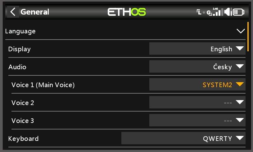 Funkcia Multi Voice poskytuje možnosť výberu rôznych systémových hlasových súborov v rámci danej jazykovej sady. Výberom môže byť predvolený systém ETHOS Hlas 1 (hlavný hlas), alebo používateľ poskytne alternatívne sady hlasov (Hlas 2 a Hlas 3, ktoré môžu mať odlišný tón, mužský hlas, ženský hlas atď.