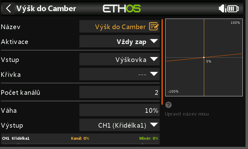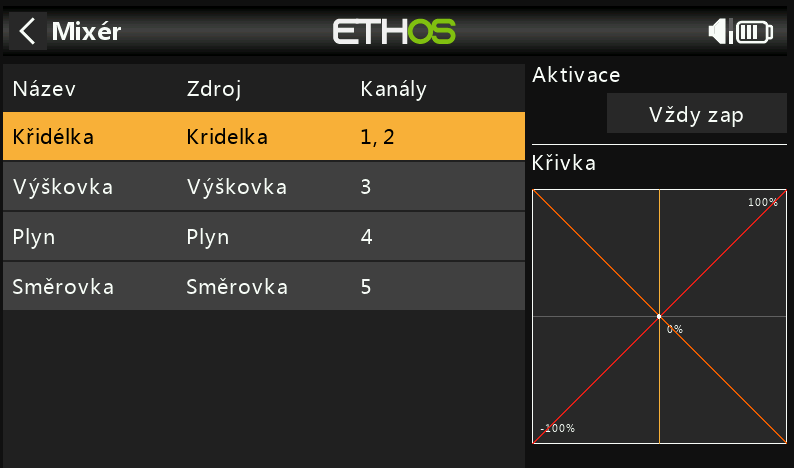 A když potom kouknu do mixů, tak vidím křidélka na kanálech 1,2 , výškovka 3, plyn 4, směrovka 5