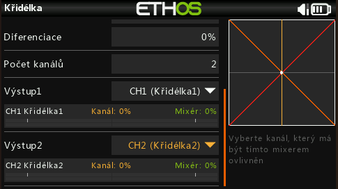 - kde najdu přiřazení, že křidélka ovládám pravým kniplem do strany (tedy kromě módu), nebo klapky konkrétním ovládacím prvkem? To se právě řešilo i v menu Vstupy.