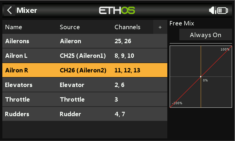 V přednastavených mixech pro křidélka, výškovku a směrovku je maximální počet výstupů omezen na 4. Opravdu velká letadla ale mohou mít pro rozložení zatížení i 3 nebo 4 zgangovaná serva na jednu plochu.