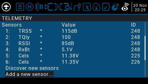 Takže jsem vzal po ruce ležící X8R napojil jedno MLVSS a přes LUA změnil ID (z 2 na 3). Pak přidal druhé MLVSS na oba napojil 3S baterku a zkusi detekovat senzory. Oba vidím, u obou blikají hvězdičky oba ukazují napětí. Víc hrát se mi s nimi nechtělo (rozdělit na jednotlivé články...)