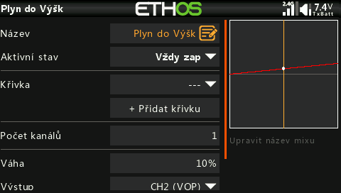 Přidám (před mix plynu) volný mix, kterým budu do pomocného kanálu (CH10) posílat signál pro plyn z přepínače, páky, případně upravený křivkou dle letového režimu. Jako nejjednodušší příklad vezmu plynovou páku.