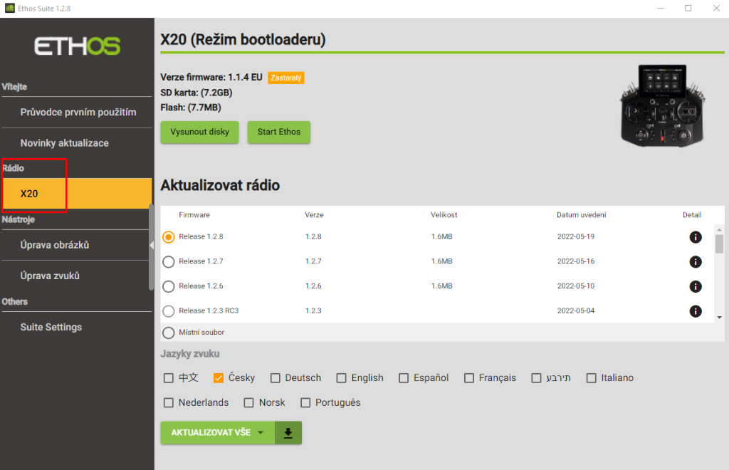 Prosím o pomoc. Bootloader aktualizován na 1.2.6, nainstalován Ethose Suite, ale při připojení radia X20S vidím pouze aktuální verzi FW 1.1.4EU a pouze možnost "Start Ethos"