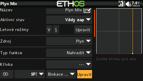 Přidám (před mix plynu) volný mix, kterým budu do pomocného kanálu (CH10) posílat signál pro plyn z přepínače, páky, případně upravený křivkou dle letového režimu. Jako nejjednodušší příklad vezmu plynovou páku.