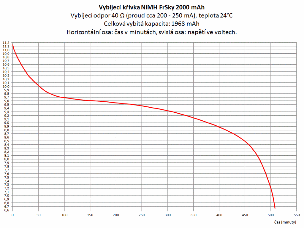 Dneska jsem změřil tu slíbenou vybíjecí charakteristiku baterky v Horusovi X12S, je to NiMH LSD, 9,6V / 2Ah. Vyšla z toho krásná křivka.