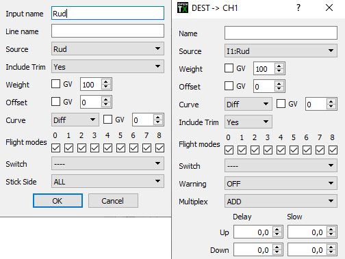 Pro kanál CH1 jen vyberu zdroj (kormidlo/rudder), u CH2 ještě změním váhu na -100.