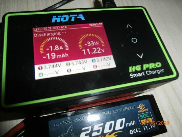 1. Moja Hota H6 Pro vybíja interne 30W, tvoja 15W. Mne to 3S aku. vybíja cca. 2A, záleži aké je momentálne napätie. Tiež mi to nedá plných 30W resp. s tým balancerom dokopi to môže byť 30W, ako aj na tvojej cca. 15W. (trebá rátať aj nieaké straty, neprestnosti na konektoroch, vodičoch a podobne)Bořík píše: ↑úte 02. čer 2020 15:19:32A jak jsi, prosím, dosáhl těch 23W ?? Ať tam připojím jakékoli baterky, tak jsem se nikdy nedostal nad 4.8W - to by odpovídalo tomu, co psal pan Urbánek. Ale je to tak trochu nedomyšlené, protože koho zajímá, co je změřeno na hlavním portu, když ten hlavní údaj - celková zátěž je nedohledatelný a tak není vlastně ani možné zjistit, jakým proudem se ta baterka vybíjí. Zatím mně nepřišly výkonové odpory pro externí vybíjení, ale podle toho zapojení v návodu je jasné, že to externí vybíjení probíhá bez balančního konektoru, což je velká škoda, protože při tom vybíjení musí být na servisním konekoru připojený Lipostop-pípák. Škoda, že si to neumí ohlídat sama nabíječka.