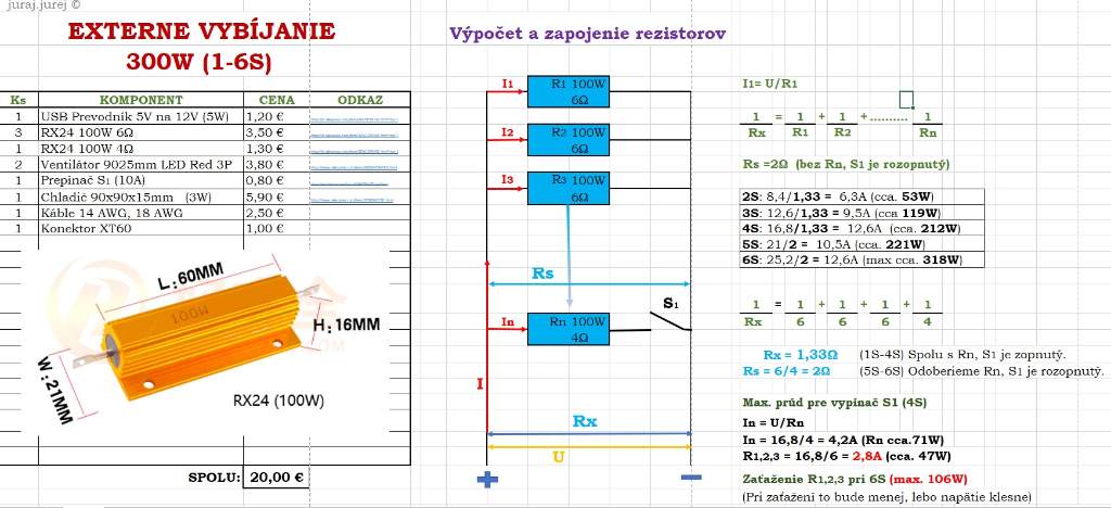 Nižšia hodnota 1,33Ω je pre 2-4S LiPo a vyššia 2Ω pre 5-6S. Odpor sa prepína vypínačom S1.