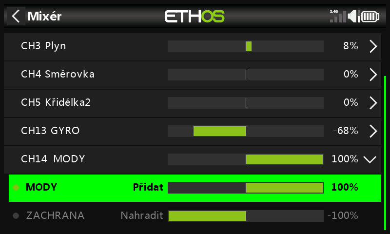 Zdravím, záchrana mi funguje pouze pro střední polohu třípolohového přepínače (+ zisk gyra z potenciometru). Jak nastavím, aby záchrana fungovala i pro dolní polohu (úplně vypnutá stabilizace)? Ve starších přijímačích to fungovalo. Díky za odpověďJan Urbánek píše: ↑pon 15. dub 2024 8:36:34U OPTX si date druhy radek na mixeru ke kanalu 14 a date nahradit je to := a spusteni bude tim SH dole a zdroj bude SH