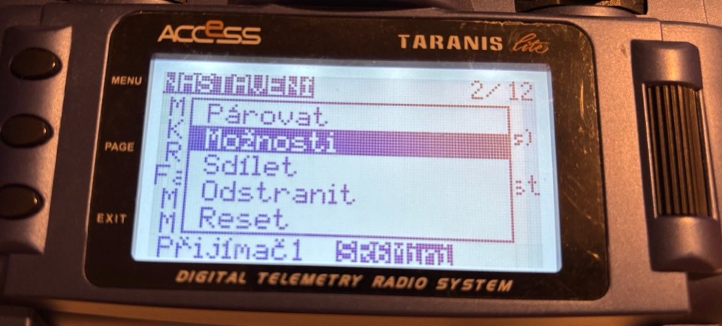 Zkoušel jsem přijímač znovu zaregistroval i spárovat, ale vždy se stejným výsledkem. Všechno funguje co se ovládání a telemetrie týče, jen se prostě není možné dostat do nastavení. Asi se nakonec na to vykašlu ... udělal jsem LUA skript na měření výdrže baterie a oním 1S 250 mAh to vydrží až 1,5 hodiny.