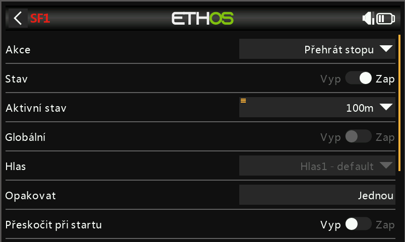 Nemám to ještě odzkoušené, ale já nastavil 3P switch tak, že v první poloze je ticho, ve druhé čte výšku co 5 s a ve třetí zapne zvuk vária. V sekvenci je tak přehrát hodnotu a zdroj telemetrie/výška. Tedy bez toho logického spínače...