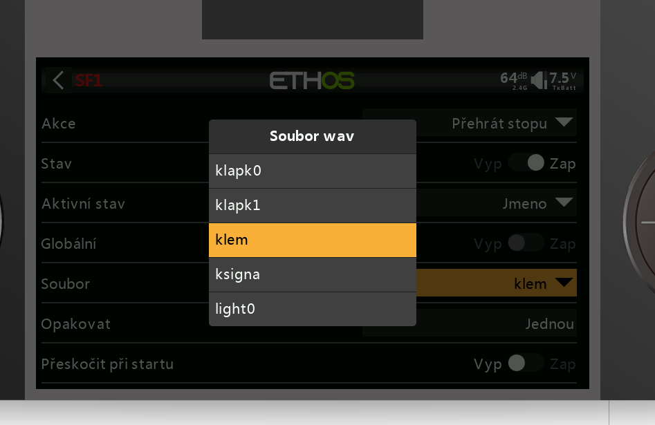 Mám Horuse 12 s Ethosem, když aktivuju přehrávání stopy ve WAV souboru, nelze přehrávání zastavit. Prostě celá stopa musí dojet na konec, což mi vadí. U OTX u Taranise mám např přepínačem v dané poloze zapnutí, jinou polohou tohoto přepínače přehrávání stopu ukončím.