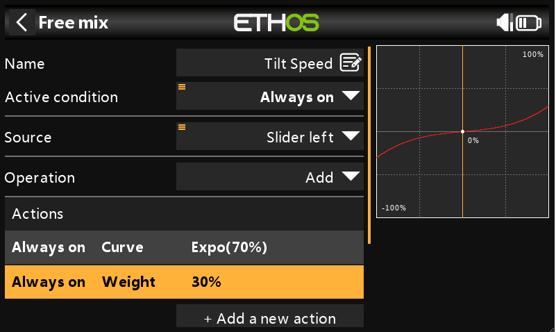 Free mix: Tilt Vstup, Zdroj Slider, Horní a dolní váha 30%, Výstup Ch64 - umožňuje nastavit maximální rychlost, případně expa