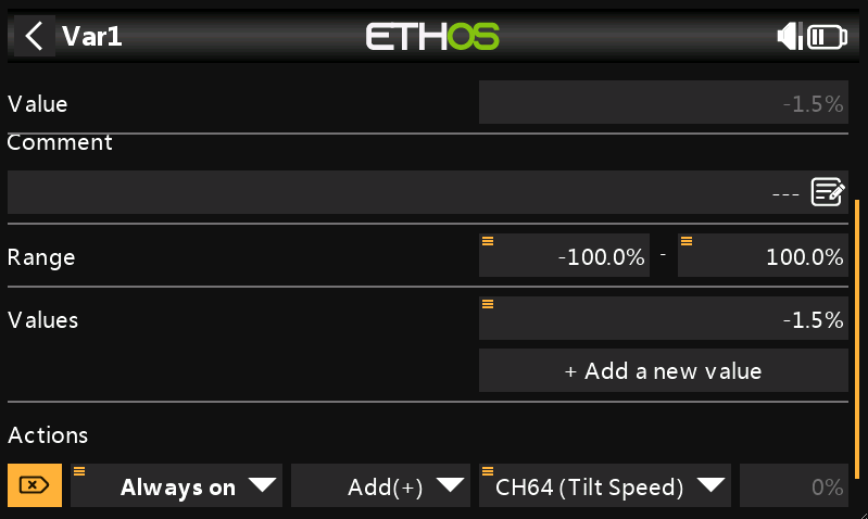 2) Nakonfigurujeme Proměnnou Var s názvem "VarTilt", kde v akcích bude podmínka vždy zapnuto, operace přičíst a zdroj (podržet pole) vybereme kanál 64 (Výstup Tilt Speed)