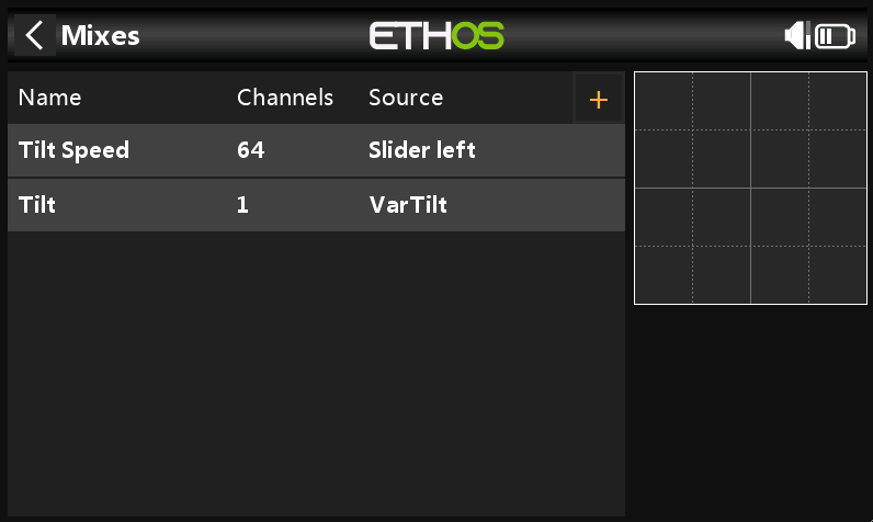 3) Nakonfigurujeme Volný mix, výstup na kanál serva, jehož zdroj bude naše Proměnná "VarTilt"