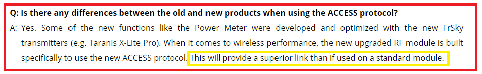 FrSky dlouho na svych strankach hlasilo, ze vsechny soucasna a starsi radia (psali konkretne "transmitters") budou podporovat ACCESS. Prisne vzato se tam o modulech nepsalo. Tohle tam bylo: